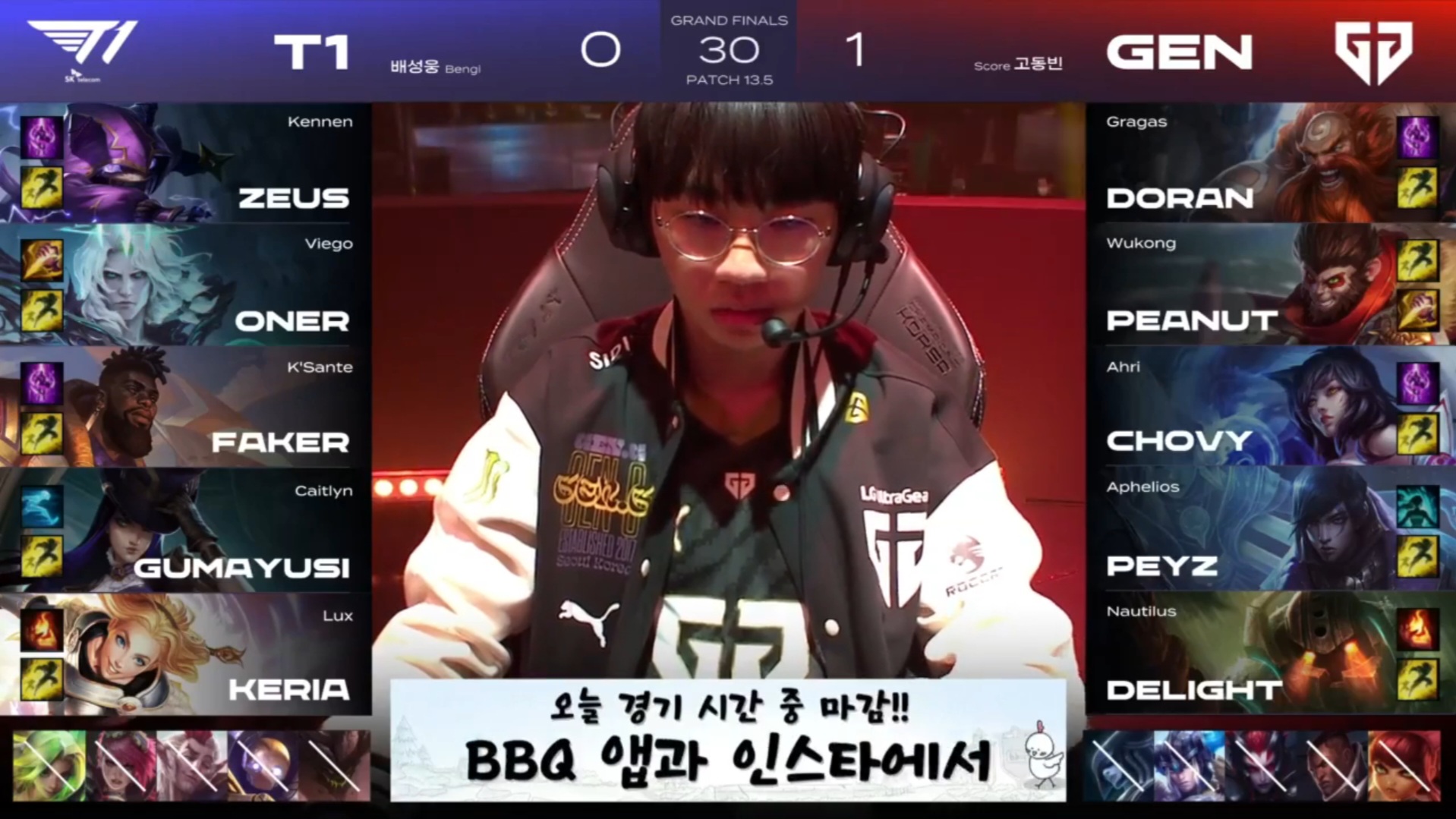 2세트도 패한 T1이 다시 한번 블루진형을 선택했고 결국 도란에 그라가스를 벤했는데요. 3세트 초반에는 젠지가 유리하게 끌고 가서 3대 0으로 젠지가 이기나 젠지팬으로서 설레발을 치고 있었는데 역시 T1! 잘 큰 구마유시에 징크스가 활약하면서 젠지가 3세트를 결국 T1 한테 내주었고 이거 잘못하면 승승패패패 나오는 거 아냐라는 걱정이 들었습니다.